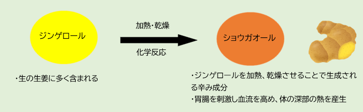 地下(地中)で育つ根菜類などは体を温めます。 生姜に含まれるジンゲロールという辛み成分に血行促進作用があり、体を温める働きがあります。 また、生姜を加熱や乾燥させると、辛み成分がショウガオールに変化し、胃腸を刺激して内臓の働きが活発になるため、体の中から温められます。