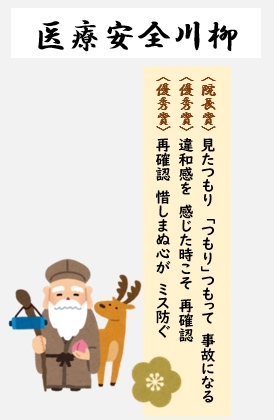 厚生労働省が定める「医療安全推進週間」に合わせ、当院では毎年、職員から医療安全に関する川柳を募集しています。応募作品の中から10作品を外来に掲示し、11月20日から12月4日までの期間、来院された患者さまと職員で投票を行いました。その結果、右の3作品が選ばれました。職員一同、これからも患者さまとともに、安全な医療を目指してまいります。